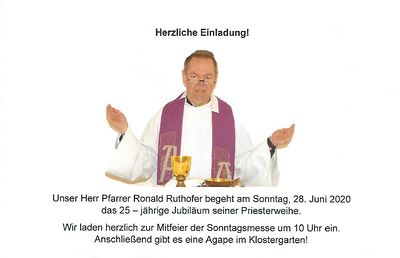 Pfarrer Ruthofer 25-jähriges Priesterjubiläum. Wir laden herzlich zur Mitfeier der Sonntagsmesse am 28. Juni um 10 Uhr ein